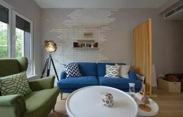 文化磚的沙發(fā)墻,在上邊做隔板架,清新精致又愜意。